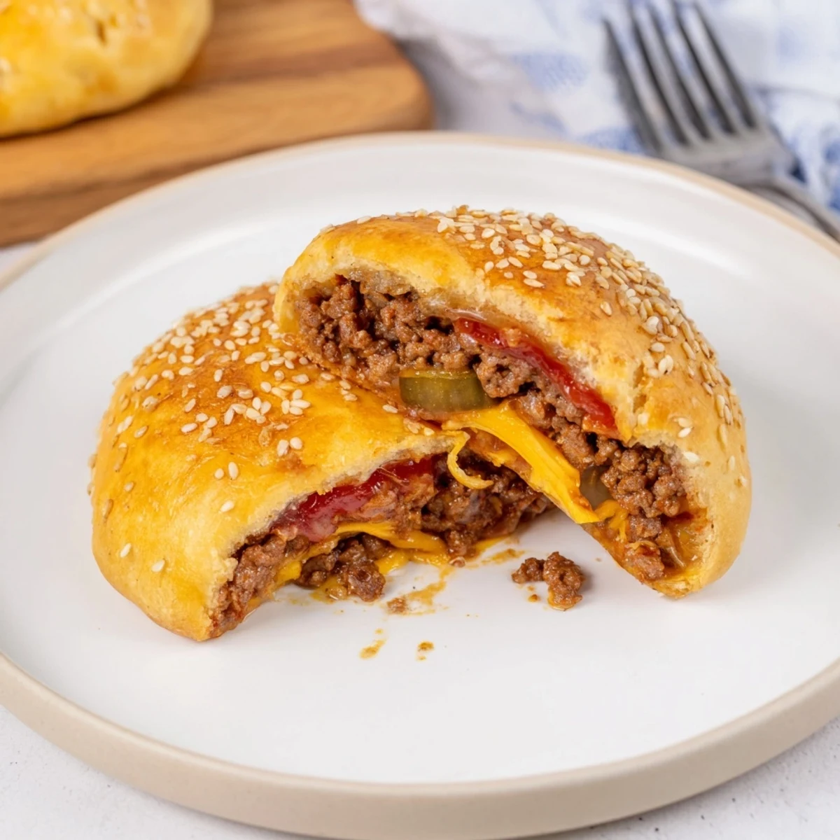 These cheesy cheeseburger bombs combine seasoned ground beef, shredded cheddar and a molten mozzarella cube wrapped in biscuit dough. Sauté onion with beef and seasonings, stir in ketchup, mustard and Worcestershire, then spoon onto flattened biscuits. Seal each ball, brush with egg, sprinkle sesame and bake at 200°C (400°F) for 15–18 minutes until golden. Makes 8 handhelds; let cool briefly before serving.
