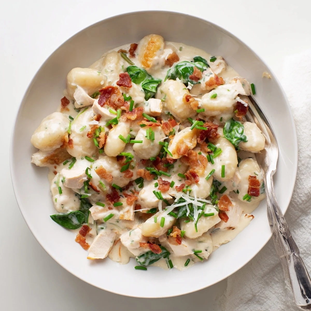 Potato gnocchi cooks directly in the creamy sauce, absorbing all those delicious flavors as they become tender. The result is a harmonious blend of textures—soft pillowy gnocchi, succulent chicken, crispy bacon bits, and wilted spinach all coated in a luscious cheesy sauce. Finished with optional fresh chives, this American-style main dish serves four generously and pairs beautifully with a crisp salad or warm garlic bread.