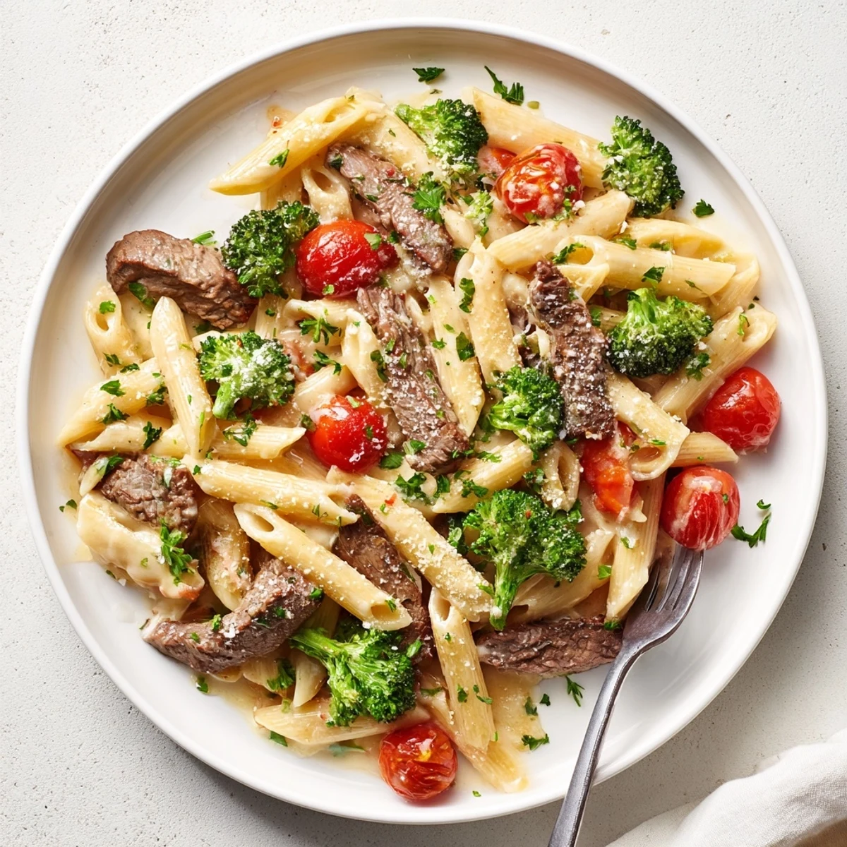 This satisfying pasta combines seared sirloin steak strips with al dente penne, tender broccoli florets, and sweet cherry tomatoes. The creamy garlic sauce ties everything together with Parmesan and a hint of red pepper flakes for subtle warmth. Perfect for a hearty dinner that serves four, this Italian-American inspired dish comes together in under an hour.