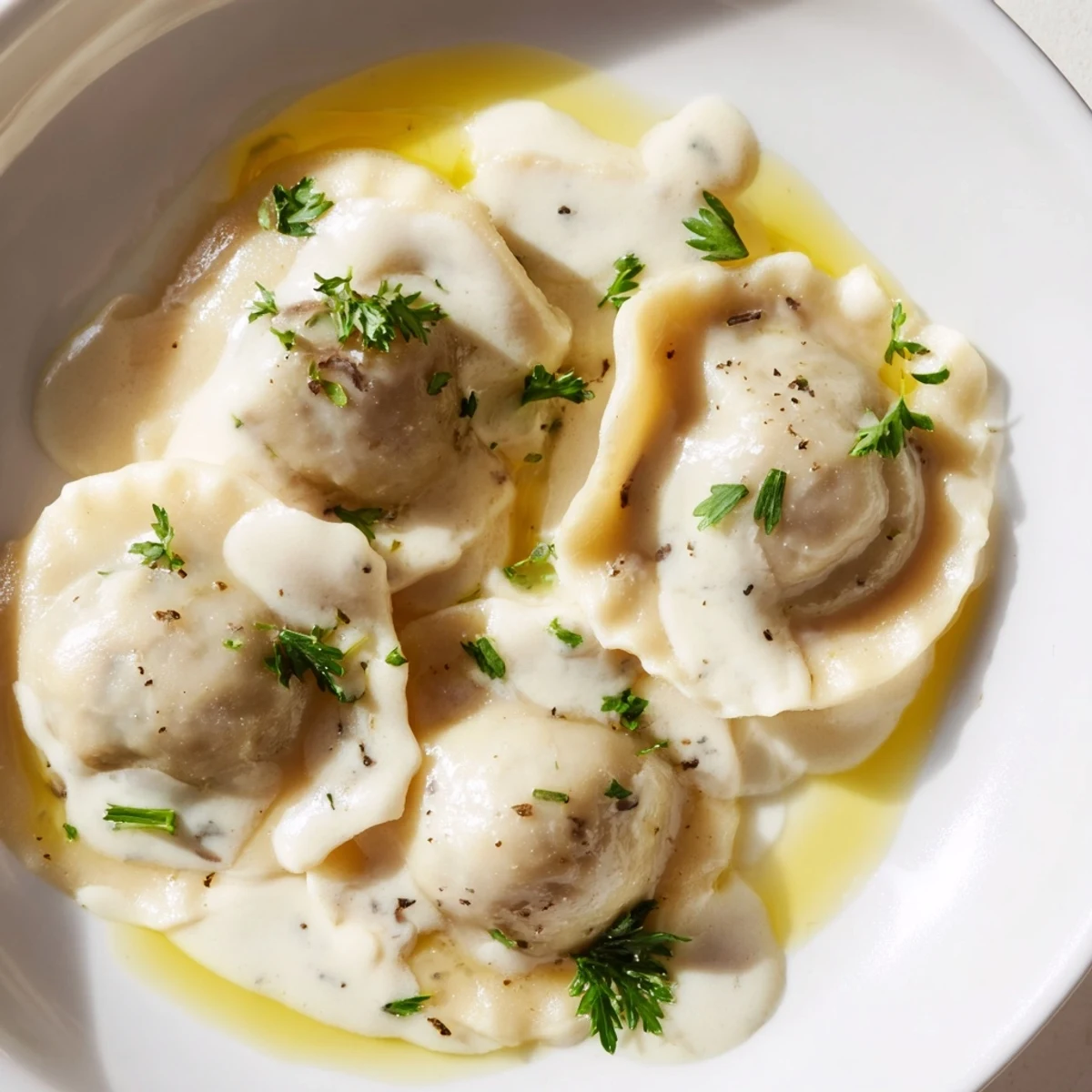 - Gently toss the cooked ravioli in the warm sauce just to coat them, then divide between two plates and finish with that final drizzle of truffle oil and a sprinkle of fresh parsley.